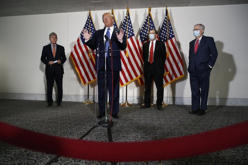 FILE - In this May 19, 2020, file photo President Donald Trump speaks with reporters after meeting with Senate Republicans at their weekly luncheon on Capitol Hill in Washington. Standing behind Trump are Sen. Roy Blunt, R-Mo., from left, Sen. John Barrasso, R-Wyo., and Senate Majority Leader Mitch McConnell of Ky. The battle for control of Congress this fall is solidifying into a race about Trump. (AP Photo/Patrick Semansky, File)