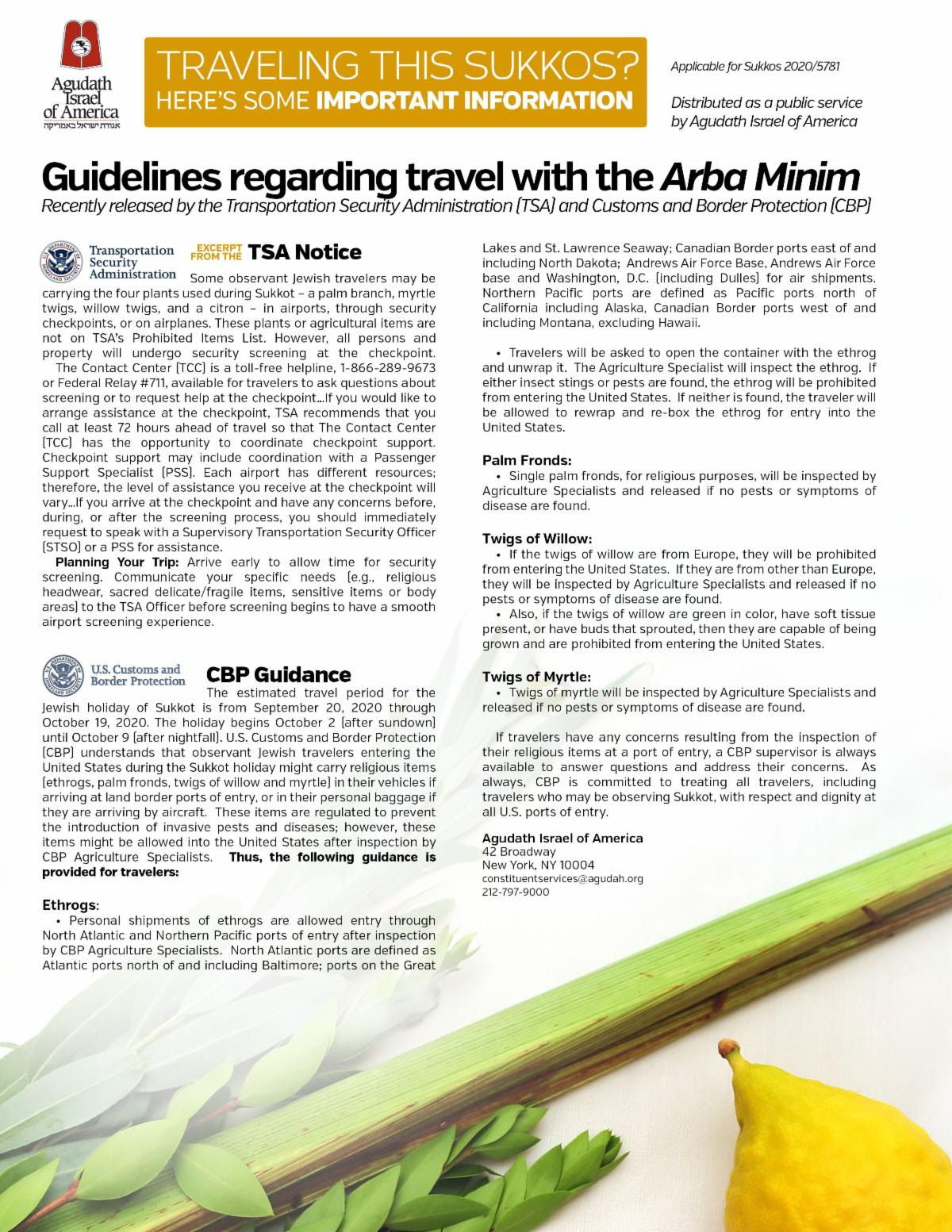 As in past years, Agudath Israel of America’s Washington Office has worked closely with agencies of the U.S. Department of Homeland Security to help avoid potential problems for travelers carrying arba minim.