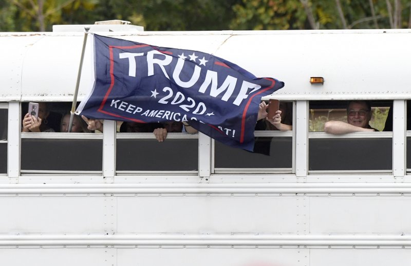 Supporters of President Donald Trump arrive by bus for a Trump campaign rally at Harrisburg International Airport, Saturday, Sept. 26, 2020, in Middletown, Pa. (AP Photo/Steve Ruark)