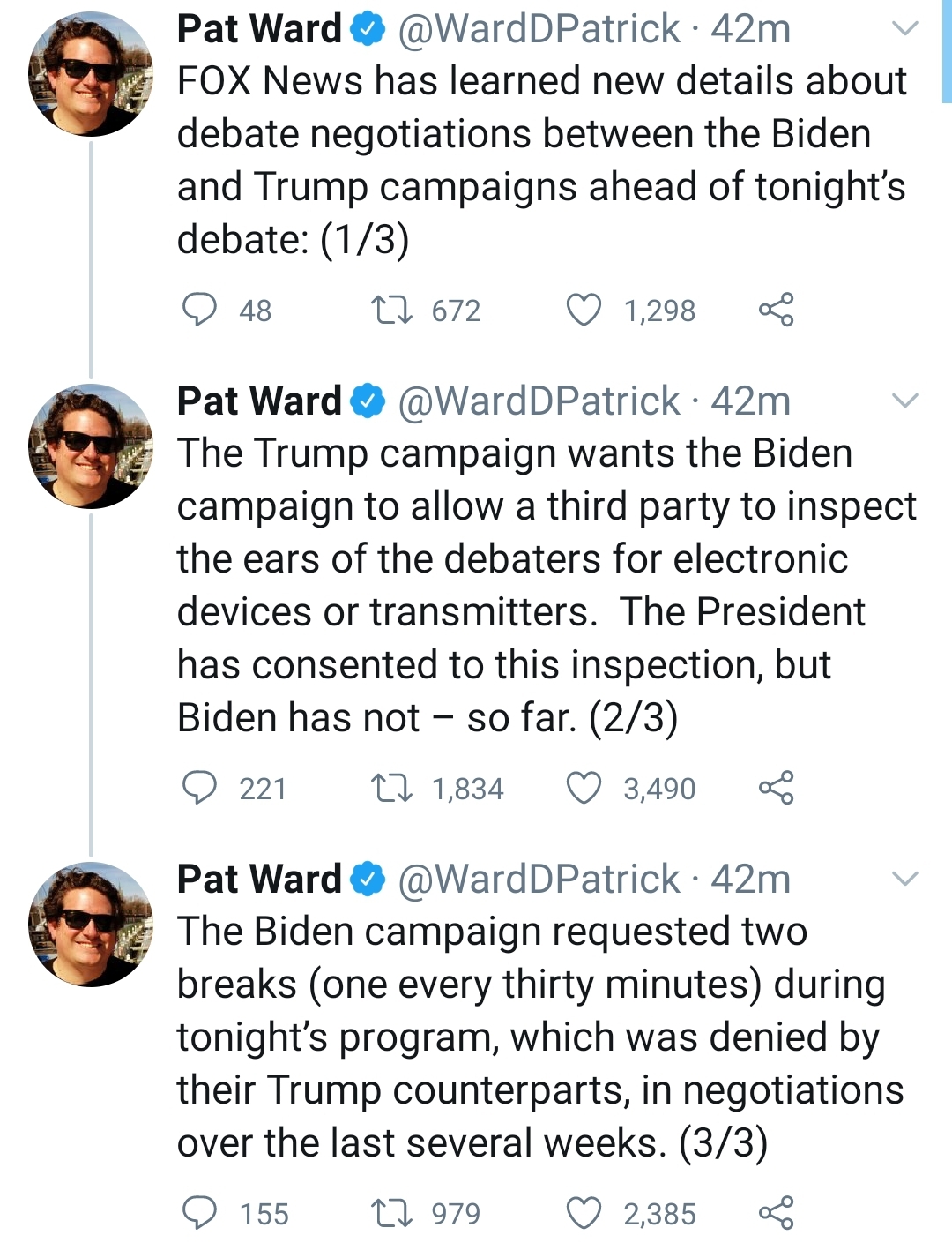 It gets better: A few days ago the Biden campaign originally agreed to the earpiece check but then changed its mind. How much more blatant can they get that they are planning to use a device, just like they falsely accused W Bush of doing.