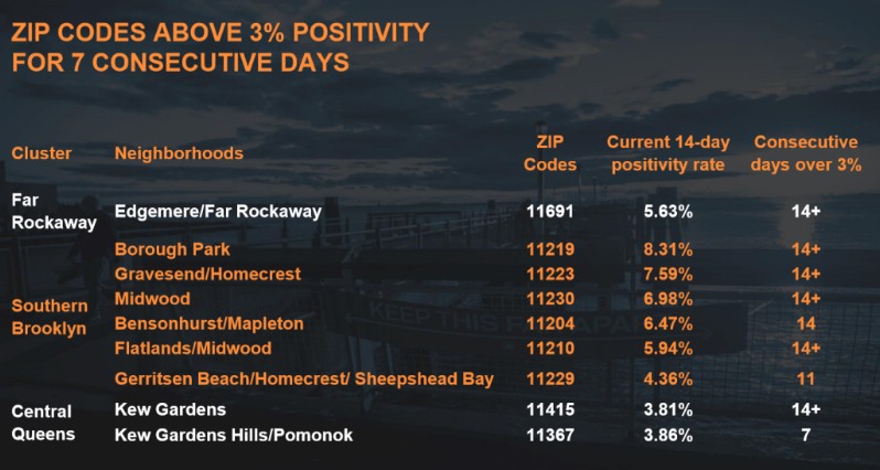 Right now, the restrictions apply only to hotspot ZIP codes in Southern Brooklyn, Far Rockaway and Central Queens. The mayor initially announced his proposed shutdown in what has become a rare Sunday briefing, one prompted by soaring positivity rates in some areas that are evolving into widespread transmission.