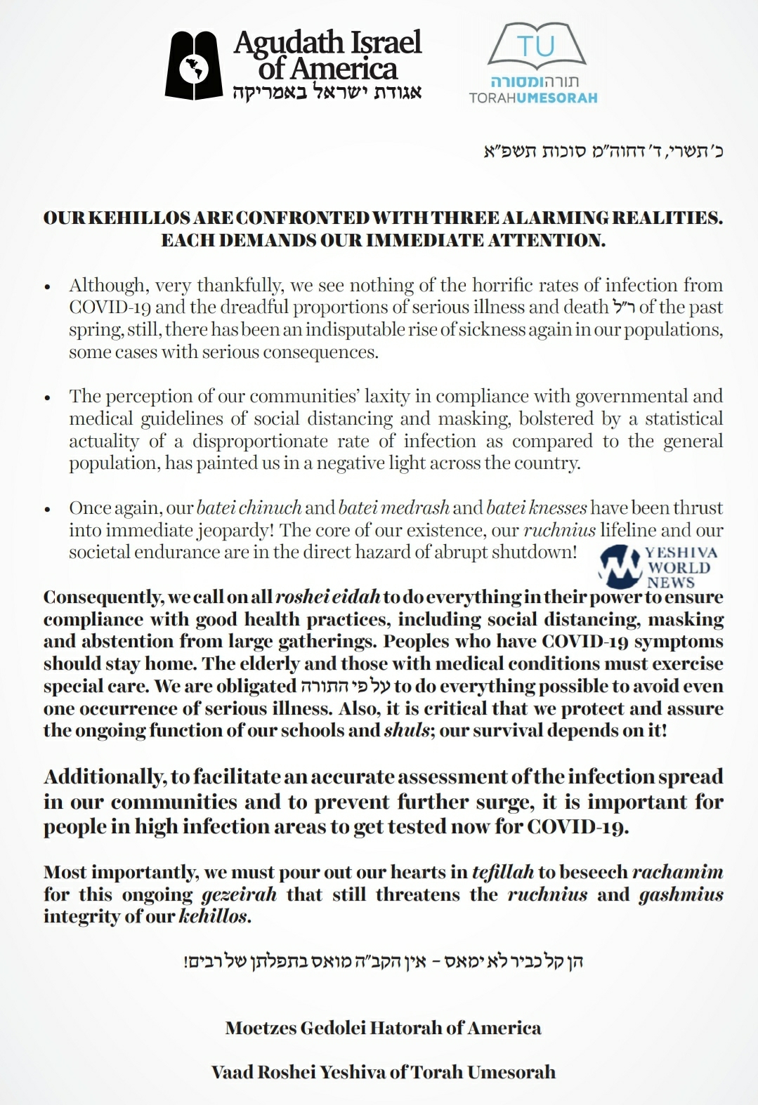 Consequently, we call on all roshei eidah to do everything in their power to ensure compliance with good health practices, including social distancing, masking and abstention from large gatherings. Peoples who have COVID-19 symptoms should stay home. The elderly and those with medical conditions must exercise special care. We are obligated על פי התורה to do everything possible to avoid even one occurrence of serious illness. Also, it is critical that we protect and assure the ongoing function of our schools and shuls; our survival depends on it! Additionally, to facilitate an accurate assessment of the infection spread in our communities and to prevent further surge, it is important for people in high infection areas to get tested now for COVID-19.