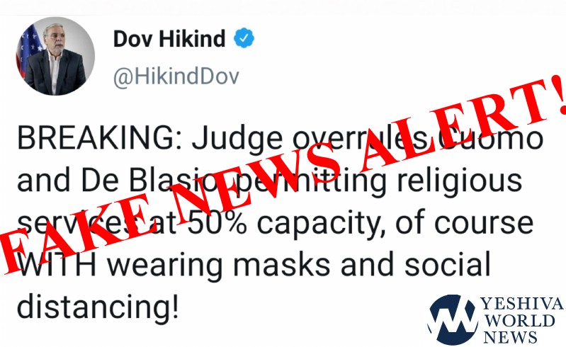 A tweet from former NYS Assemblyman Dov Hikind went viral in seconds the past 30 minutes, claiming that the judge overruled NY Governor Cuomo and said that Shuls can be 50% capacity.