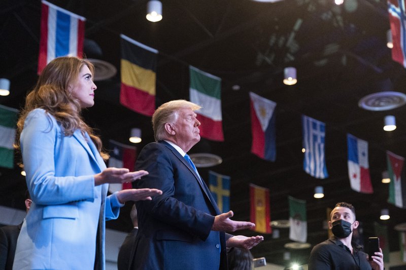 President Donald Trump closes his eyes as he accepts blessings as he attends church at International Church of Las Vegas, Sunday, Oct. 18, 2020, in Las Vegas, Nev. Counselor to the President Hope Hicks is at left. (AP Photo/Alex Brandon)
