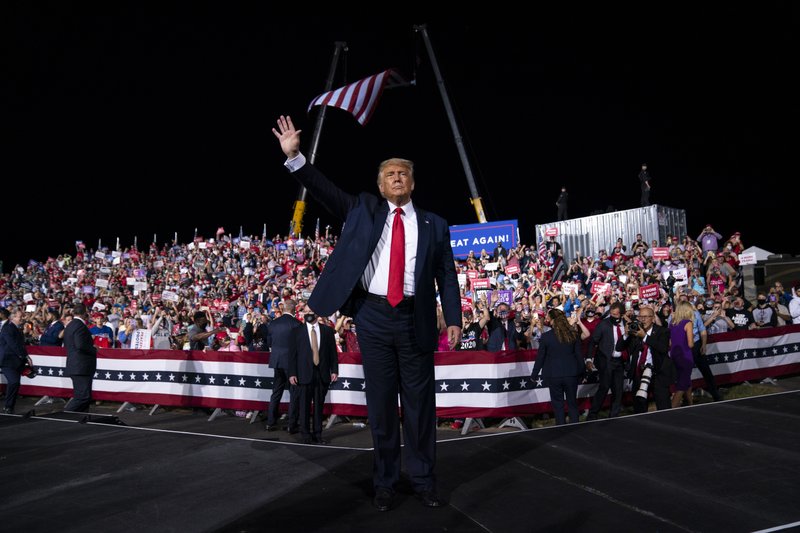 President Donald Trump waves to the crowd as he walks off stage after speaking at a campaign rally at Gastonia Municipal Airport, Wednesday, Oct. 21, 2020, in Gastonia, N.C. (AP Photo/Evan Vucci)