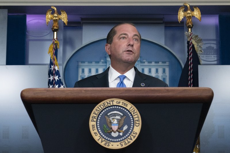 FILE - In this Aug. 23, 2020, file photo, Health and Human Services Secretary Alex Azar speaks during a media briefing in the James Brady Briefing Room of the White House in Washington. Trying to pull back the veil on health costs to encourage competition, the Trump administration on Oct. 29, will finalize requirements for insurers to tell consumers up front the actual prices for common tests and procedures. (AP Photo/Alex Brandon, File)