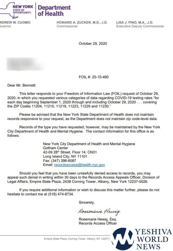 With thousands of children locked out of Yeshivos and small businesses drowning in fines the leaders and elected officials try every angle and tools to impress upon Governor Cuomo and Mayor deBlasio the untold damage being inflicted on their helpless citizens. So far press conferences, public appeal videos, & social media posts have not moved the needle. With Court cases winding their way through the system, community activists Chaskel Bennett and Leon Goldenberg filed FOIL requests to NYS DOH asking to see accurate Covid numbers in hopes that with better numbers, activists could better focus their extensive efforts on solving the problem. As the states response below reads, the state is passing the buck to the city and leaving community leaders to wonder why the zip code numbers are such a secret. Conspiracy theories aside, this seems to be standard Cuomo vs Deblasio with the Jewish community once again, stuck in the middle.