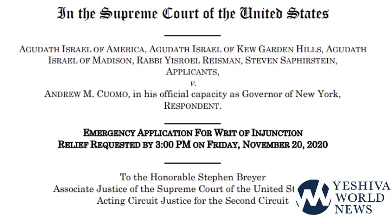 Agudath Israel of America has taken its case to the U.S. Supreme Court, filing for an injunction to block New York’s “Cluster Initiative” against shuls and other houses of worship. The Agudah suit was filed together with the Agudath Israel of Kew Garden Hills and its shul Secretary, Mr. Steven Saphirstein, and the Agudath Israel of Madison and its Rav, Rabbi Yisroel Reisman, shlita.