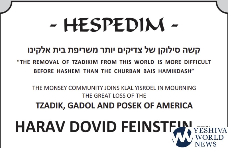 There will be Divrei Hesped in Monsey tonight for Hagaon HaRav David Feinstein ZATZAL.