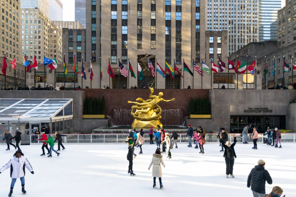 The website says there’s legend that the rink was inspired by “a Depression-era skate salesman who demonstrated his product by skating on the frozen water of the Rockefeller Center fountain.” It officially opened as a “skating pond” in 1936. It was supposed by temporary but became so popular it became a permanent fixture for the holiday season.
