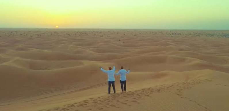 “We chose to film the clip davka on the sand dunes of Dubai,” Salomon said. “We wanted to emphasize the gap between the unimaginable wealth you see in the city to the simplicity and emptiness of the endless dunes of the desert.”