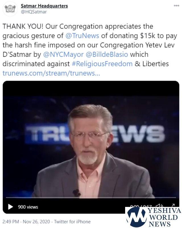 THANK YOU! Our Congregation appreciates the gracious gesture of @TruNews of donating $15k to pay the harsh fine imposed on our Congregation Yetev Lev D’Satmar by @NYCMayor @BilldeBlasio which discriminated against #ReligiousFreedom & Liberties https://t.co/qP4IoyCwpo pic.twitter.com/5Eztv1fUIr