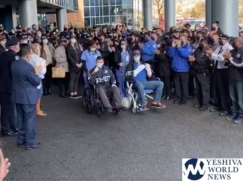 Video shows officer Christopher Wells, 36, and officer Joseph Murphy, 33, in wheelchairs as they left Jamaica Hospital to bagpipes and cheers from NYPD members on Thursday.