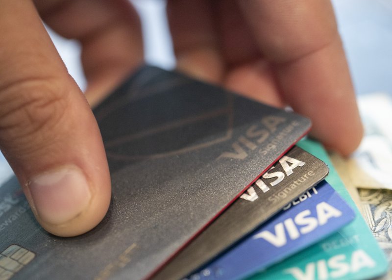 FILE - This Aug. 11, 2019 file photo shows Visa credit cards in New Orleans. The coronavirus pandemic hasn’t stopped Americans from keeping up with their credit card payments, thanks in large part to government relief programs passed by Congress earlier this year. For some, however, the ability to keep buying things with plastic and then pay the bill likely depends on whether current negotiations in Washington produce another round of economic aid. (AP Photo/Jenny Kane, File)
