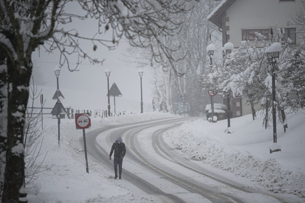 Pedestrian walks along the snow covered road in the small village of Espinal, northern Spain, Sunday, Dec. 6, 2020. (AP Photo/Alvaro Barrientos)