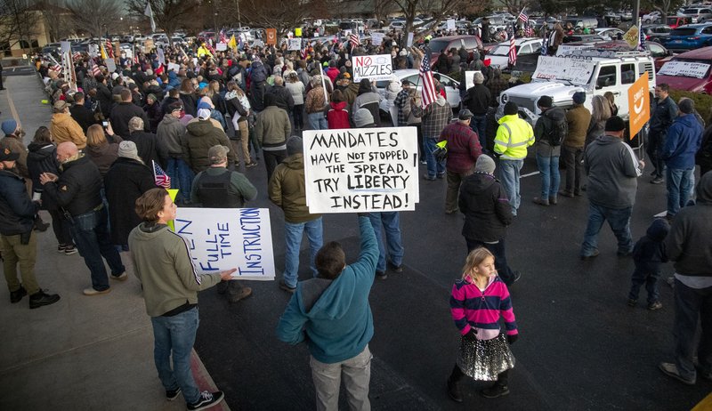 FILE - In this Dec. 8, 2020, file photo, anti-masker demonstrators converge on Central District Health offices in Boise, Idaho, to the protest a meeting deciding on more mandates to combat the spread of COVID-19. Arguments over mask requirements and other restrictions have turned ugly in recent days as the deadly coronavirus surge engulfs small and medium-size cities that once seemed a safe remove from the outbreak. (Darin Oswald/Idaho Statesman via AP, File)