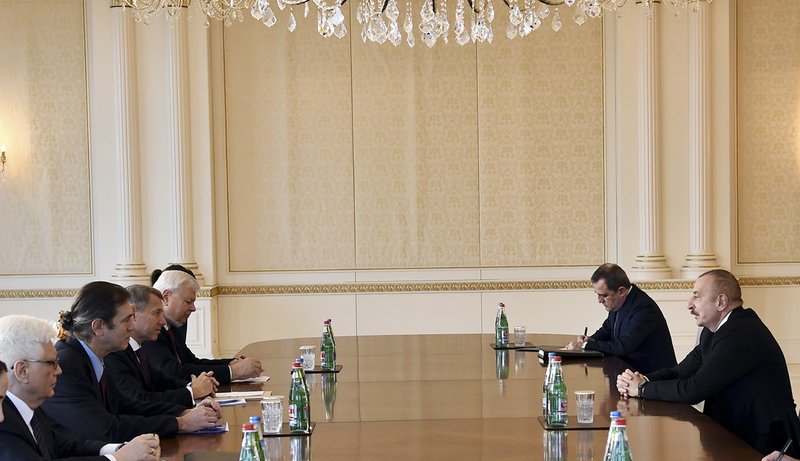 In this photo provided on Saturday, Dec. 12, 2020, by the Azerbaijan's Presidential Press Office, Azerbaijani President Ilham Aliyev, right, speaks to members of the OSCE Minsk Group co-chairs Stephane Visconti of France, Andrew Schofer of the US, Russian Ambassador to Azerbaijan Mikhail Bocharnikov and Personal Representative of the OSCE Chairperson-in-Office Andrzej Kasprzyk in Baku, Azerbaijan. Armenian officials on Saturday accused Azerbaijan of breaching a peace deal that ended six weeks of fierce fighting over Nagorno-Karabakh. Separatist officials in Nagorno-Karabakh said the Azerbaijani military launched an attack late Friday that left three local ethnic Armenian servicemen wounded. (Azerbaijani Presidential Press Office via AP)