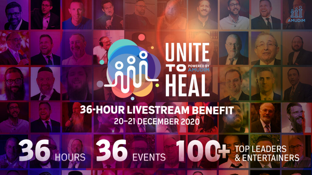 36 Hours. 36 Events. 100+ Leaders, Entertainers, and Community members. For the first time ever, leaders from around the world are joining together to give back to our communities and confront the greatest challenges and unspoken issues we all face. From clinicians to Rabbanim, public figures, community leaders and musicians, panel discussions and entertainment, there is something for everyone as we join Amudim and Unite to Heal.