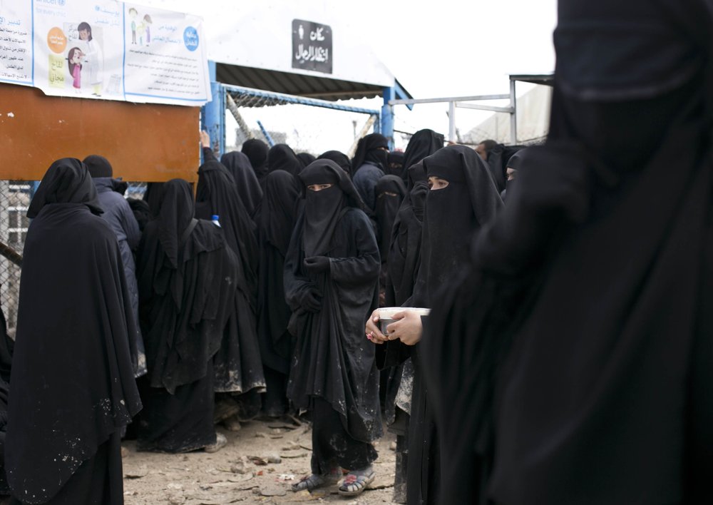 Illustrative. In this Sunday, March 31, 2019, photo, women line up for aid supplies at Al-Hol camp in Hassakeh province, Syria. The camp is past full capacity, with more than 70,000 residents from former Islamic State-held areas in Syria. (AP Photo/Maya Alleruzzo)