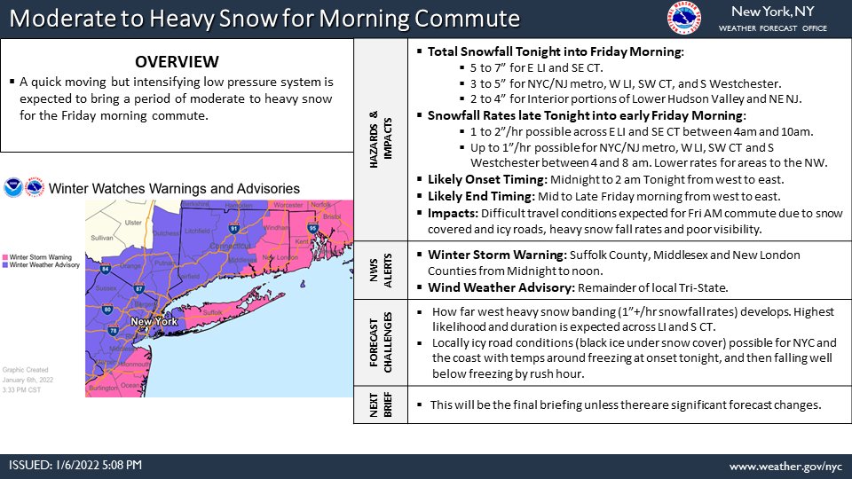 They system is expected to bring quick-moving snow and high winds, prompting warnings for Suffolk County on Long Island and Monmouth and Ocean counties in New Jersey.