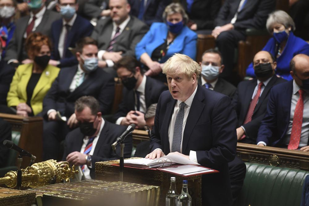 In this photo provided by UK Parliament, Britain's Prime Minister Boris Johnson speaks during Prime Minister's Questions in the House of Commons, in London, Wednesday, Jan. 12, 2022. Johnson has apologized for attending a garden party during Britain’s first coronavirus lockdown, but brushed aside opposition demands that he resign for breaching the rules his own government had imposed on the nation. The apology Wednesday stopped short of admitting wrongdoing. It was Johnson’s attempt to assuage a tide of anger from the public and politicians after repeated accusations he and his staff flouted pandemic restrictions by socializing when it was banned. (UK Parliament/Jessica Taylor via AP)