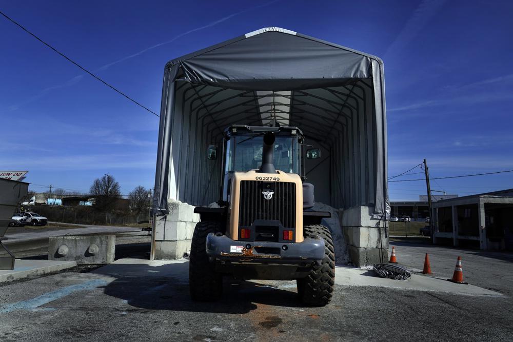 A tractor sits in front of a pile of salt used to create a brine that will help clear road of ice and snow ahead of a winter storm at the GDOT's Maintenance Activities Unit location on Friday, Jan. 14, 2022, in Forest Park, Ga. A winter storm is headed south that could effect much of Georgia through Sunday. (AP Photo/Brynn Anderson)