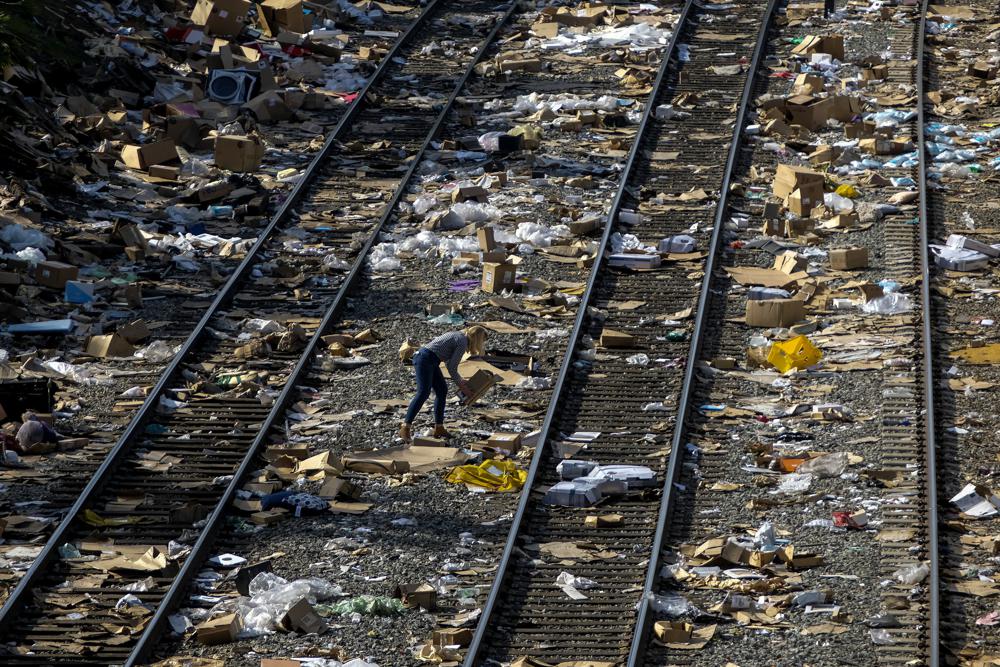 Crews made railroad repairs in Los Angeles Monday after a train derailed near the location where thieves have been raiding cargo containers, leaving the tracks littered with emptied boxes of packaged good sent by retailers.