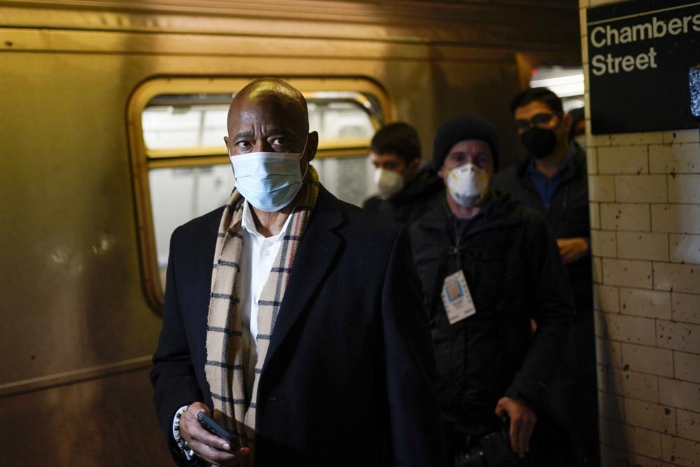 FILE — New York Mayor Eric Adams rides the subway to City Hall on his first day in office in New York, Jan. 1, 2022. Adams says the New York City subway system must be safe and New Yorkers must "feel safe" in the system. (AP Photo/Seth Wenig, File)