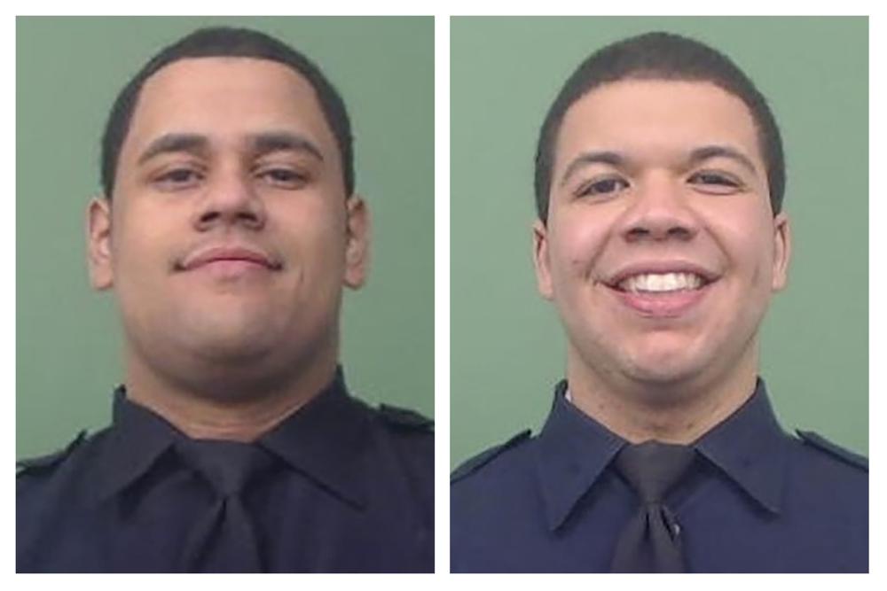 This photo combo of images provided by the New York City Police Department shows NYPD Officers Wilbert Mora, left, and Jason Rivera. The two officers were shot while answering a call about an argument between a woman and her adult son in the Harlem neighborhood of New York, Friday, Jan. 21, 2022. (Courtesy of NYPD via AP)