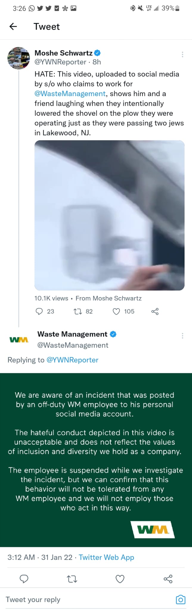 “The hateful conduct depicted in this video is unacceptable and does not reflect the values of inclusion and diversity we hold as a company. The employee is suspended while we investigate the incident, but we can confirm that this behavior will not be tolerated from any WM employee and we will not employ those who act in this way.”