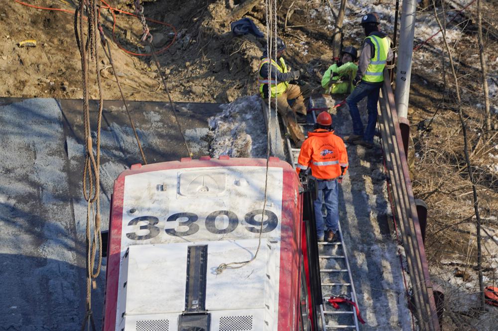A team from the National Transportation Safety Board was at the scene Monday as crews siphoned gasoline and brought in cranes to lift five vehicles and a municipal bus off the crumpled remains of the bridge.