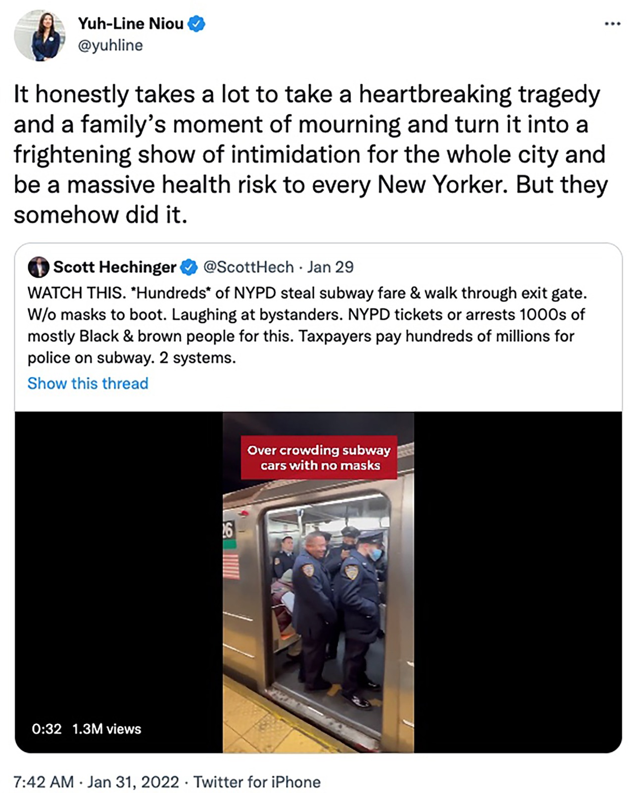 “It honestly takes a lot to take a heartbreaking tragedy and a family’s moment of mourning and turn it into a frightening show of intimidation for the whole city and be a massive health risk to every New Yorker. But they somehow did,” Niou tweeted.