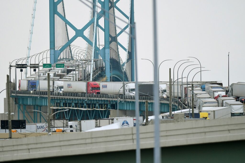 Canadian truckers protesting vaccine mandates have shut down the busiest border crossing in North America, causing traffic to back up on the highway leading from Canada to Detroit.