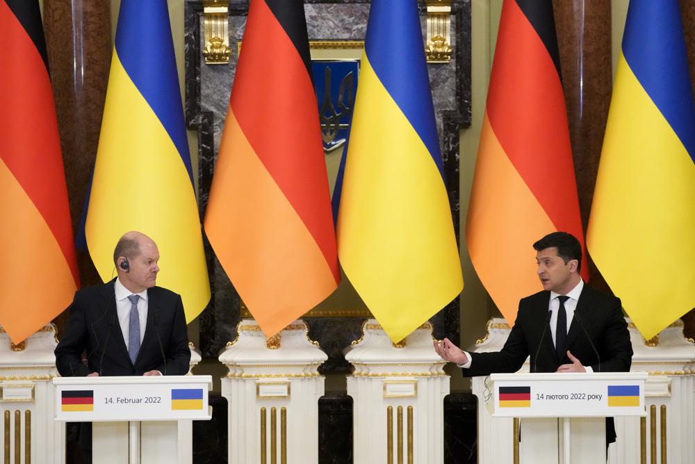 Scholz, whose visit came ahead of a meeting with Putin in Moscow on Tuesday, demanded “clear steps to de-escalate the current tensions” from Russia. He thanked the Ukrainian government for its “sober and restrained reaction to a very serious and threatening situation.”
