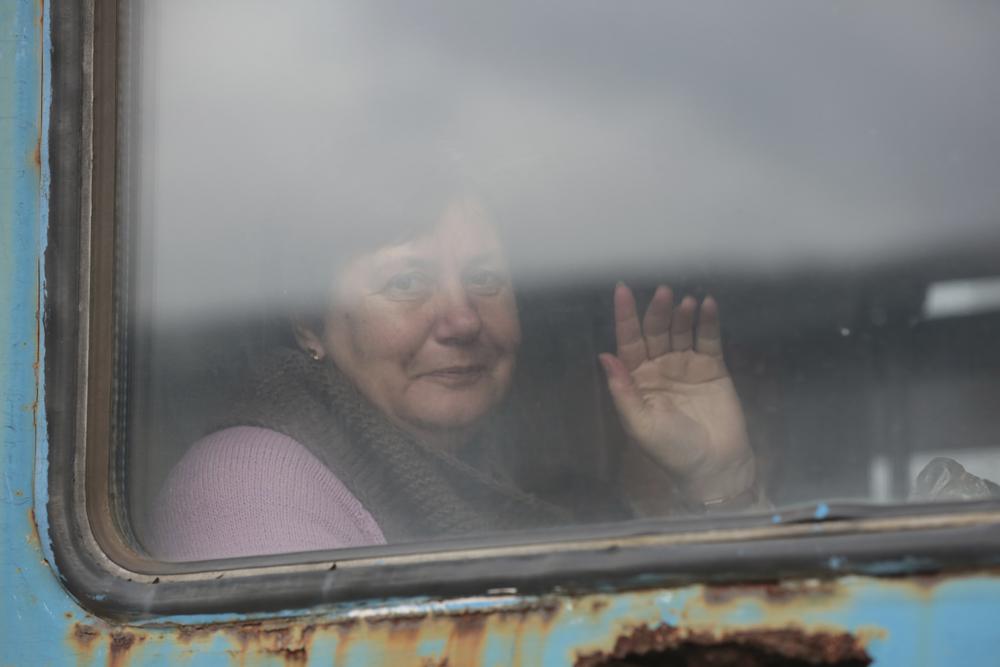 A woman waves from a train carriage to be evacuated to Russia, at the railway station in Debaltseve, the territory controlled by pro-Russian militants, eastern Ukraine, Saturday, Feb. 19, 2022. On Friday, separatist authorities in eastern Ukraine announced a mass evacuation of women, children and older adults to neighboring Russia. The moves have have fueled Western fears that Moscow could use the latest violence in eastern Ukraine as a pretext for an invasion. (AP Photo/Alexei Alexandrov)