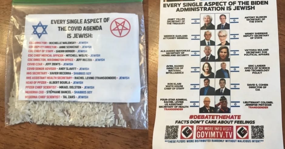 The general message is that Jews are controlling the government and possibly created COVID and are controlling COVID,” she said of the flyers’ message.