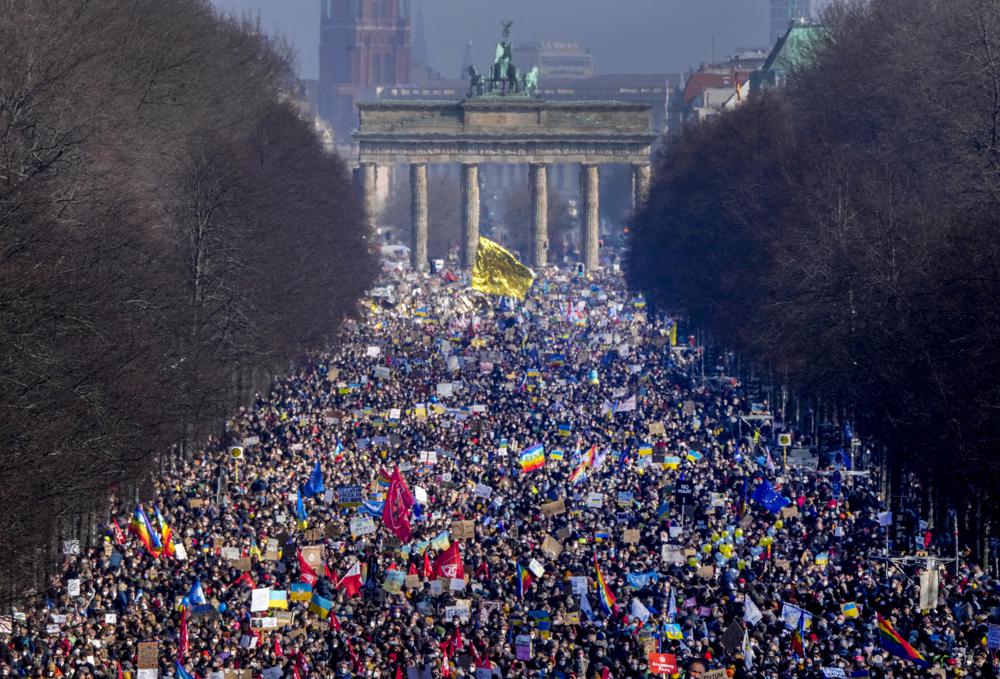 Tens of thousands of people massed Sunday in front of Berlin’s Brandenburg Gate, with some carrying posters with slogans such as “Hands off Ukraine,” “Tanks to Windmills” and “Putin, go to therapy and leave Ukraine and the world in peace.”
