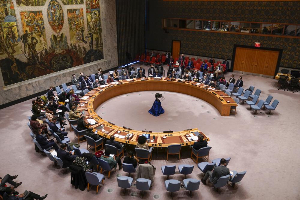 Ambassadors speak during a Security Council meeting at United Nations headquarters, Sunday, Feb. 27, 2022. (AP Photo/Seth Wenig)