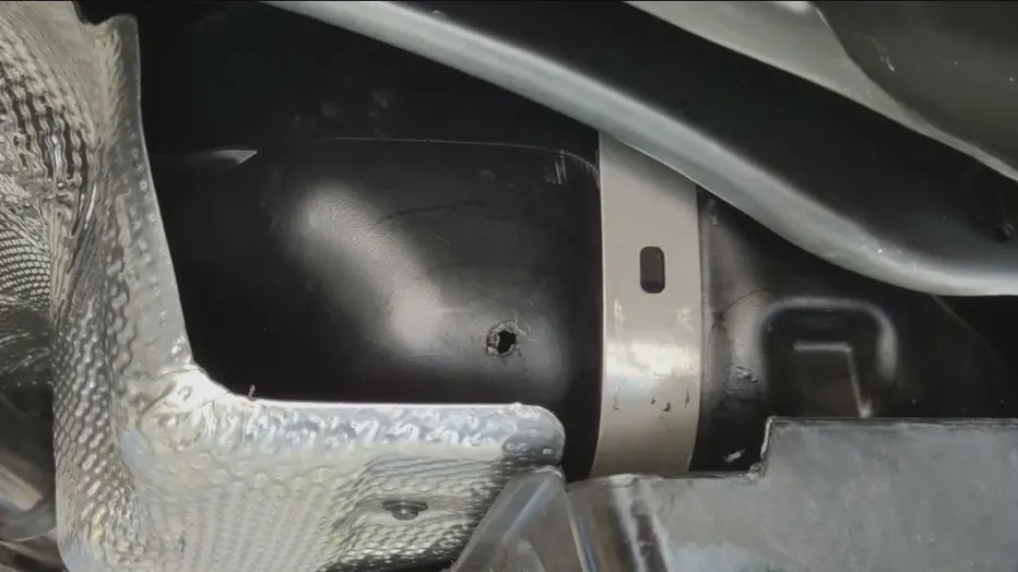 A photo shared with FOX 11 in Los Angeles shows a hole drilled into a vehicle by a thief who then siphoned the gas out of the vehicle.