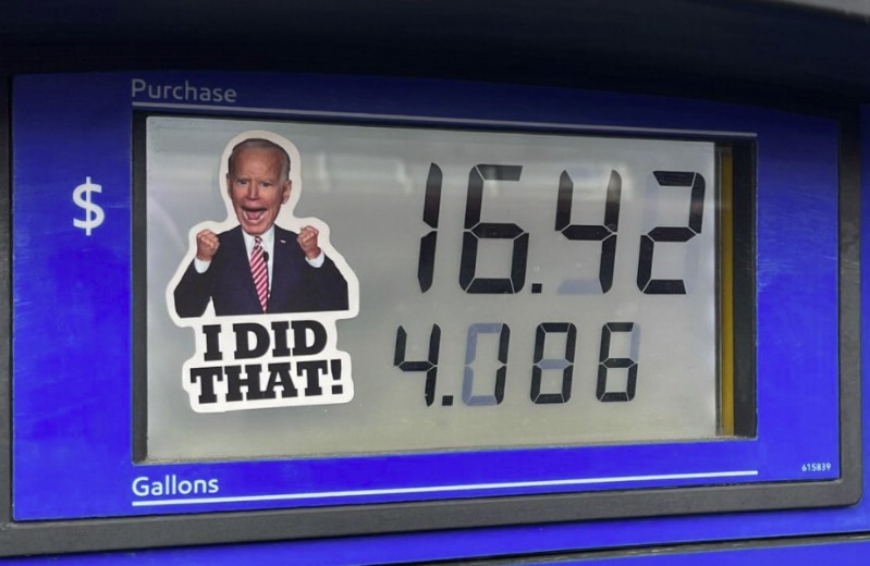 A growing number of stickers showing Biden proclaiming, “I did that” and pointing to gas prices are popping up at gas stations across the country.