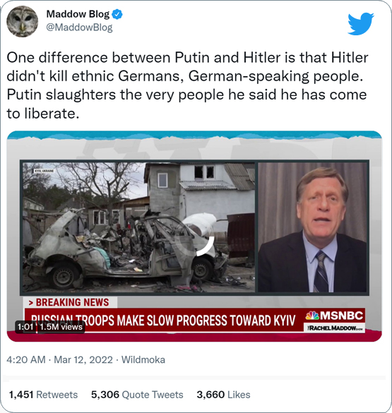 “One difference between Putin and Hitler is that Hitler didn’t kill ethnic Germans, German-speaking people. Putin slaughters the very people he said he has come to liberate,” the tweet quoted McFaul as saying.