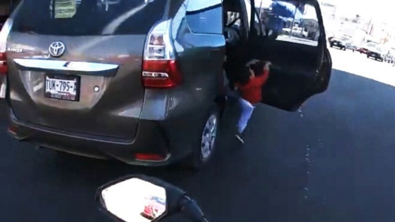 A helmet-mounted camera caught the moment a young boy in Mexico nearly fell out of a moving car, and his clinging to the vehicle’s door literally for dear life.
