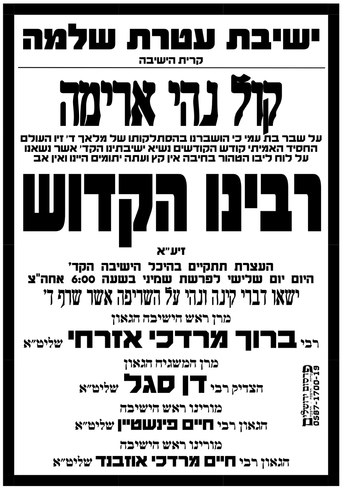 An atzeres will be held on Tuesday evening at Yeshivas Ateres Shlomo at 6 p.m. following the petirah of HaGaon HaRav Chaim Kanievsky, z’tl.