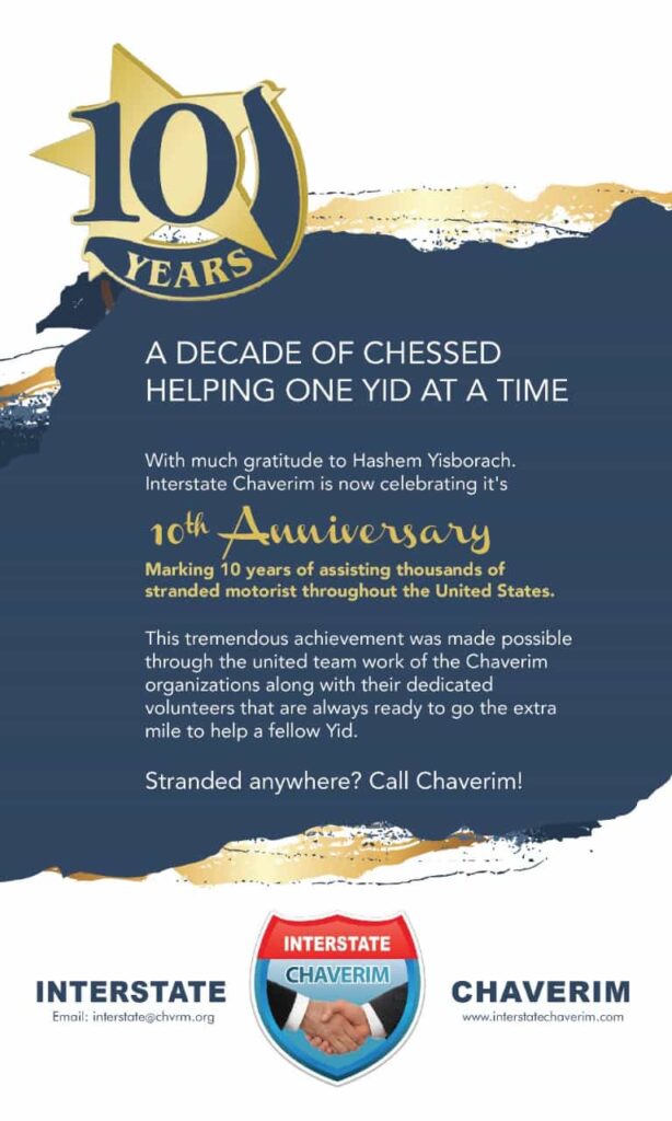 And now, we’re eagerly anticipating Interstate Chaverim’s tenth anniversary. We’re celebrating thousands of calls, helping one Yid at a time.