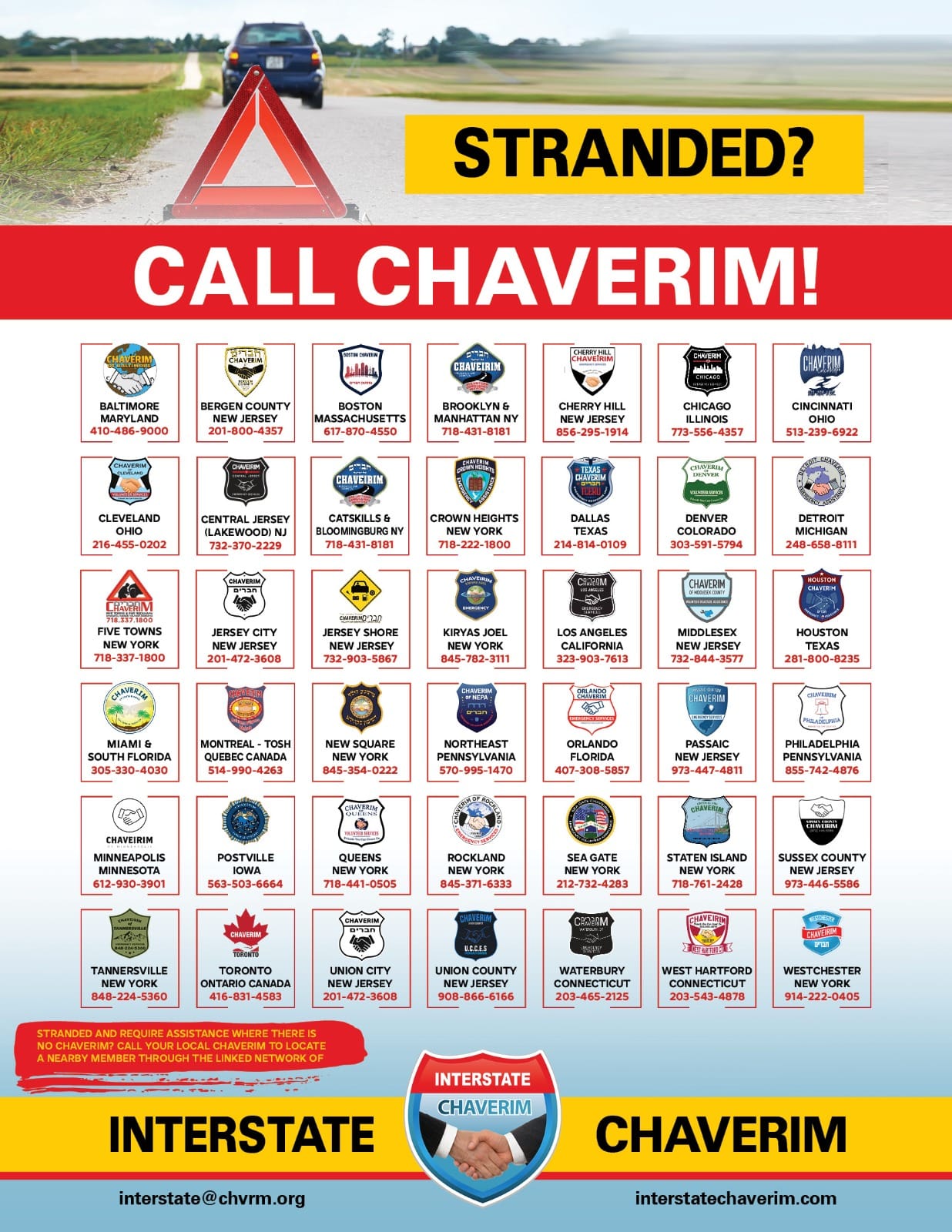 1. forever indebted! i was on the way to a big time sensitive job in philly , i wanted a “good vehicle” so i rented a new uhaul pk up truck , i was puling a trailer…and on the turnpike a tire blew on the pk up… i called uhaul… there is a turnpike number … long story short i waited an hr and gornisht .. i called interstate chaverim it took a little while but 3 amazing yidden showed up … put out flares … wait not over the uhaul had a spare but didnt have the tool to get it down.. so with no choice a chaverim member crawled Under with a small sawzall & cut the spring to release the tire … i had full coverage … WITHOUT THEM IT WOULDVE BEEN SUCH A DISASTER…my suggestion if u call and you can afford it give them a nice tip