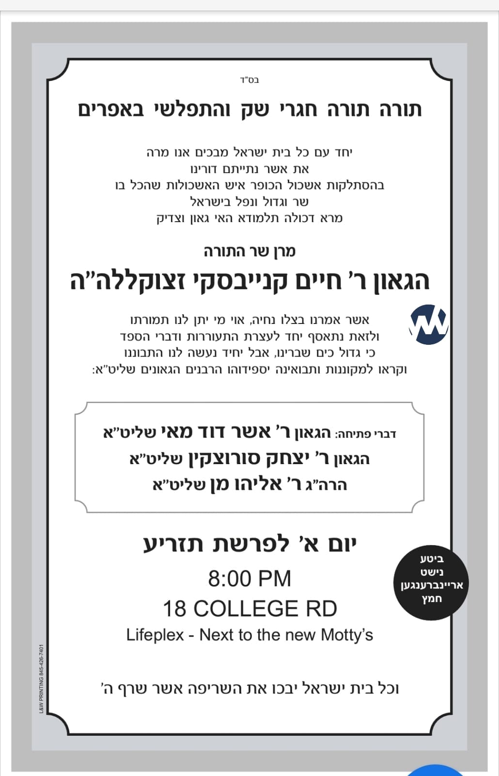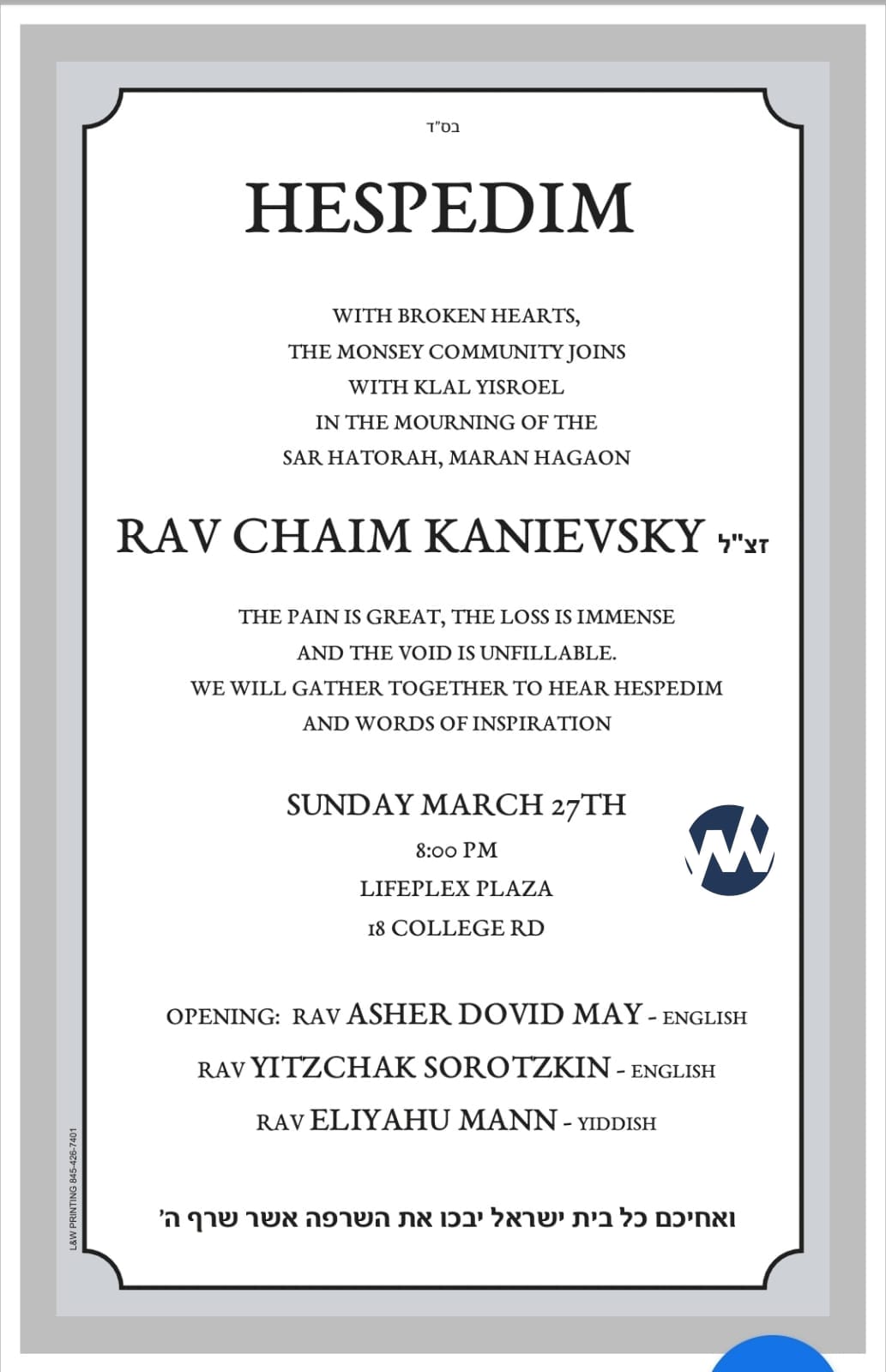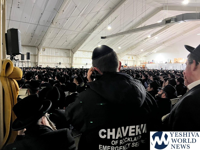 A true Kavod Hatorah! On Sunday night the Monsey community flocked in droves to the LifePlex Plaza to hear words of Hesped and inspiration upon the Petirah of the Sar Hatorah, Maran Rav Chaim Kanievsky ZT”L. As word of the distinguished and inspiring speakers went out, the organizers were contacted by local Roshei Yeshiva to find a venue large enough to host the local Yeshiva Bachurim. Additionally, requests for special Yeshiva seating came in from Yeshivos in neighboring Passaic and even as far as Boston. After consulting with the dedicated and professional Rockland Chaveirim volunteers to formulate a plan for the logistics of a venue this size, the preparations were underway. Chairs were rented, a stage was set up and a large empty warehouse was transformed into a hub for Kavod Hatorah. Thousands of Bachurim, Yungerleit and Baalei Batim, Litvish and Chasidish, united in mourning the loss of the undisputed Sar Hatorah of our generation.