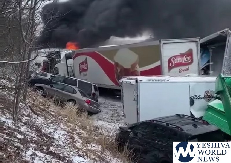 Footage uploaded to social media on Monday showed an out of control tractor-trailer smash into a large dump truck, turning it nearly 180 degrees. Another large truck spewed black smoke and orange flames into the air and an SUV struck a passenger car sending the sedan spinning, narrowly missing its driver who stood on the shoulder of the highway shrouded in snow and fog.