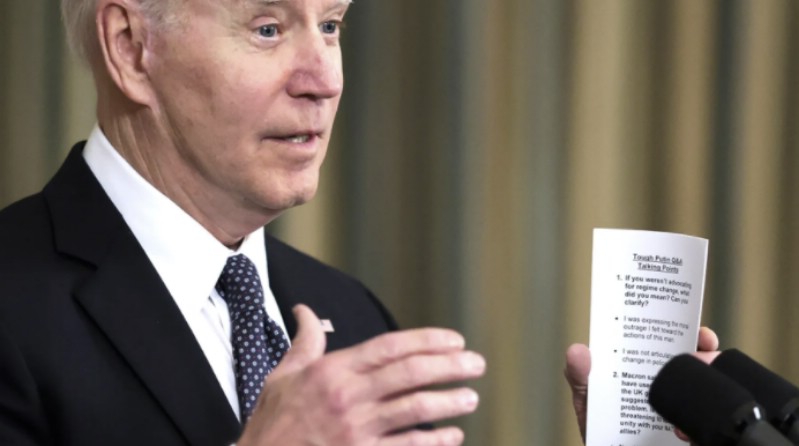 President Joe Biden was seen using a card with prepared answers on them to respond to questions from reporters about last weekend’s blunder in which he implied that the U.S. wants to get Putin out of power.