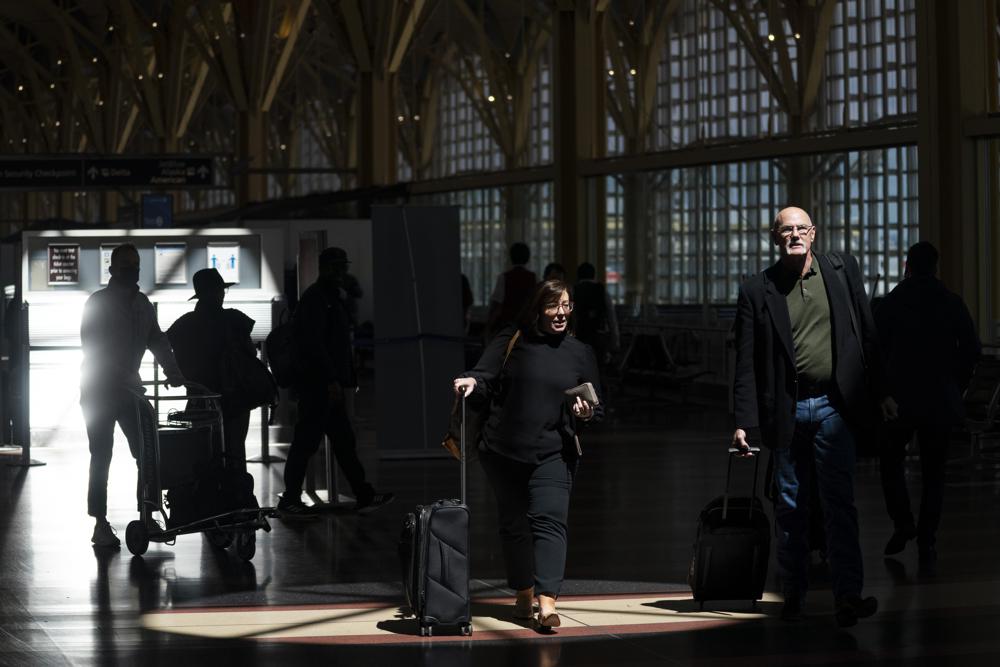 Passengers walk through the terminal at Ronald Reagan Washington National Airport, Tuesday, April 19, 2022, in Arlington, Va. A federal judge's decision to strike down a national mask mandate was met with cheers on some airplanes but also concern about whether it's really time to end the order sparked by the COVID-19 pandemic.(AP Photo/Evan Vucci)