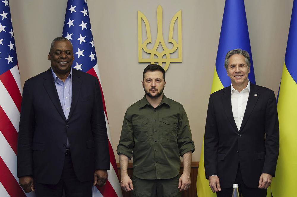 Top American officials pledged Monday to help ensure Ukraine wins its fight against Russia following face-to-face talks with President Volodymyr Zelenskyy in Kyiv, while Britain said Moscow has yet to achieve a significant breakthrough in its offensive in Ukraine’s eastern industrial heartland.